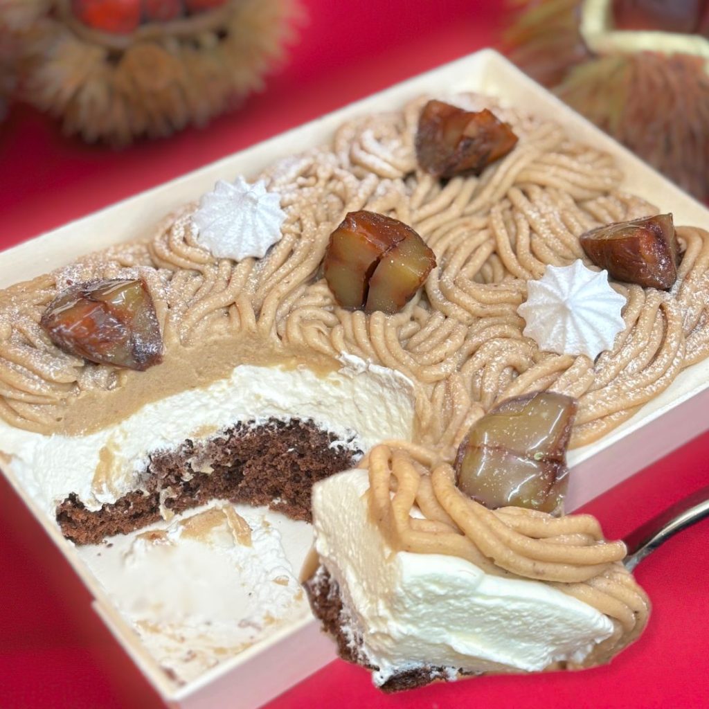 マロンペーストを混ぜ込んだ生地で、優しい甘さの特製モンブランクリームとほくほくの渋皮栗を巻き上げました。