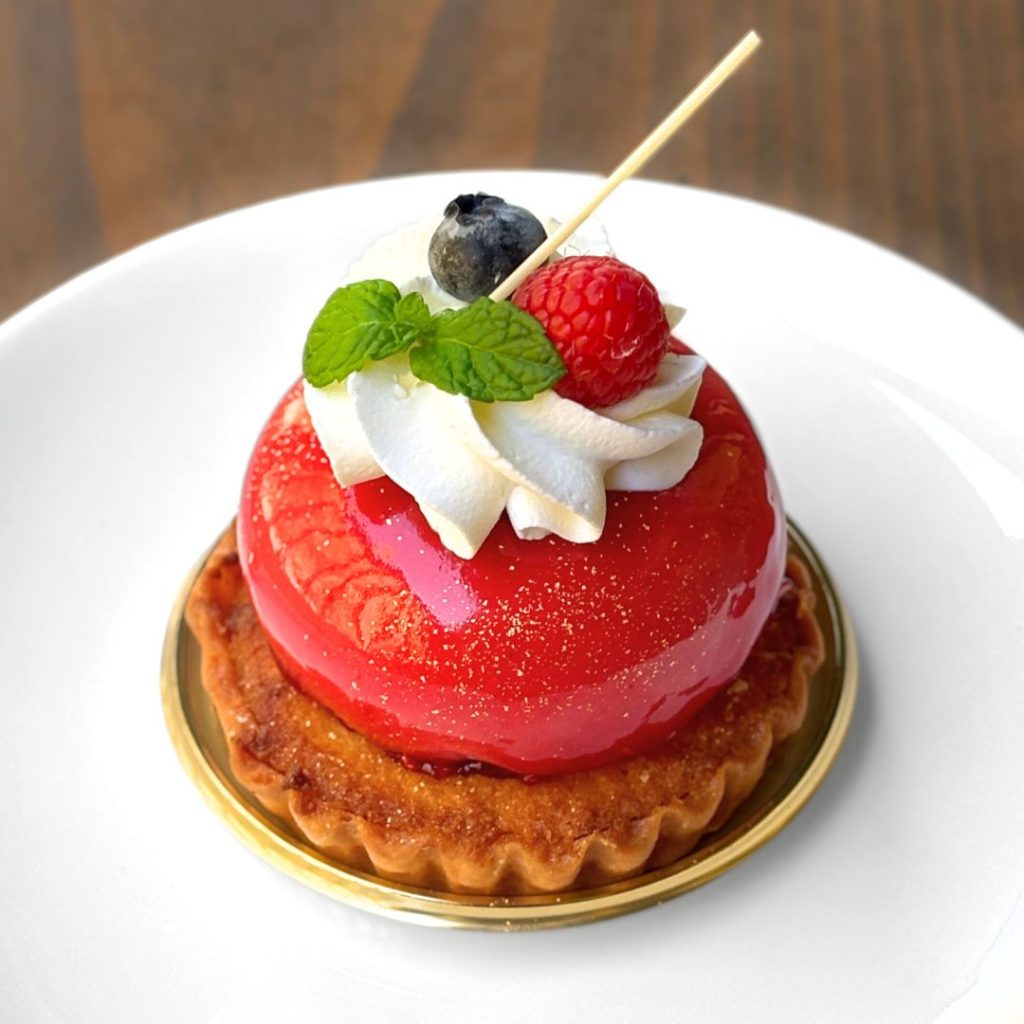 アーモンドクリームを敷き詰めたタルトに、甘酸っぱいフランボワーズムースとジャムを合わせ、真っ赤なグラサージュで魅惑的に仕上げました。中には苺のジュレ入り。