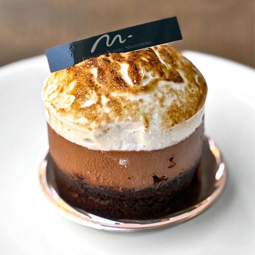 濃厚なクラシックショコラ生地に、チョコレートムースとミルク風味のイタリアンメレンゲを重ね、表面をスモア風に炙りました。