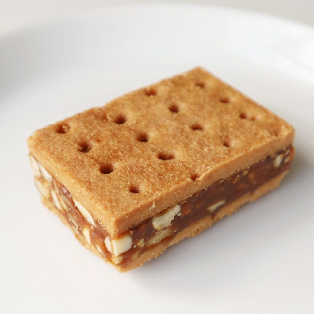 ほろ苦いキャラメルと香ばしいくるみを厚焼きサブレで挟み、濃厚リッチな味わいに焼き上げました。