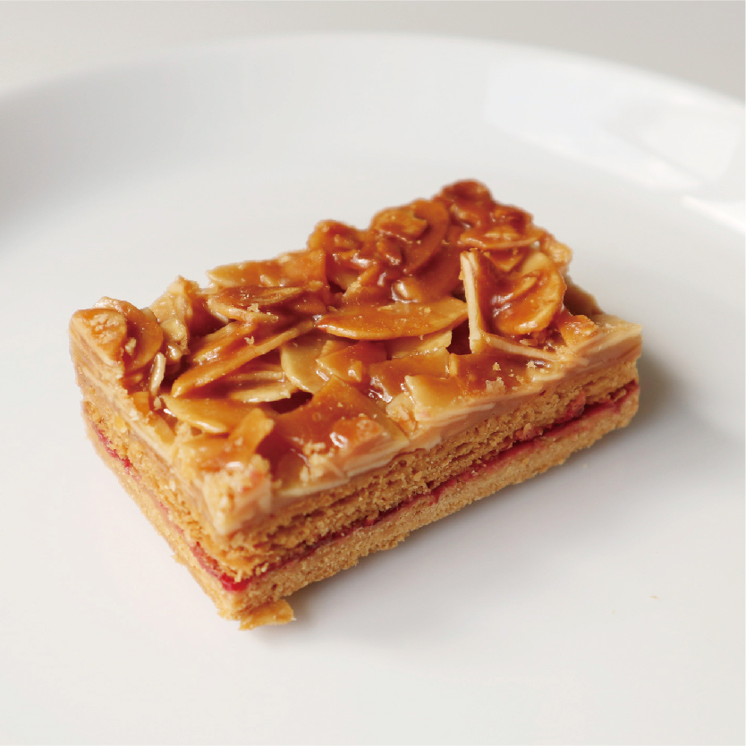 サクサクの折りパイ生地にキャラメルを絡ませたスライスアーモンド、甘酸っぱいフランボワーズジャムをのせ、カリッと香ばしく焼き上げました。