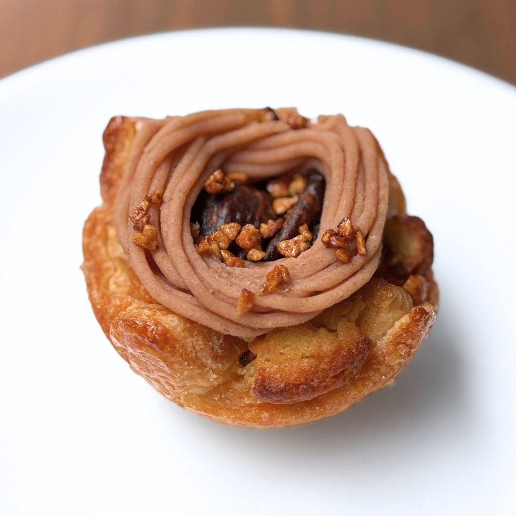 自慢のパイ生地でダマンドを包んで香ばしく焼き上げ、マロンクリームと渋皮栗をトッピングしました。