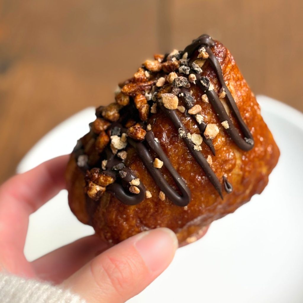 ガナッシュとナッツを包み込んだパイ生地をコロンと可愛い三角形に焼き上げ、チョコレート、ナッツのキャラメリゼ、カカオニブでデコレーションしました。
